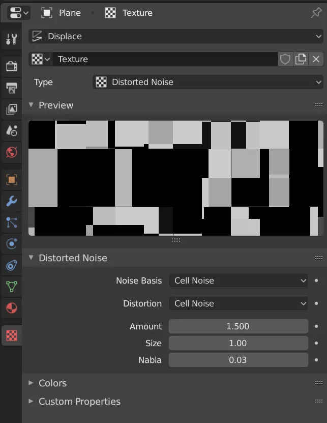 Distorted Noise Noise Basis和Distortion都选择Cell NoiseAmount控制像素大小随机性,Size控制纹理整体缩放- 纹理面板设置如下