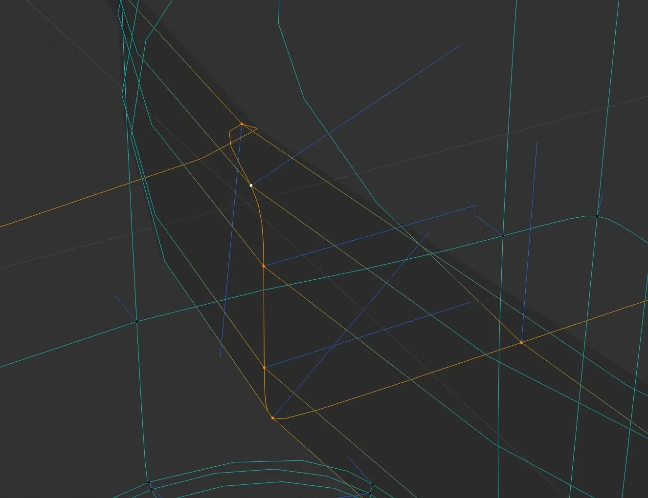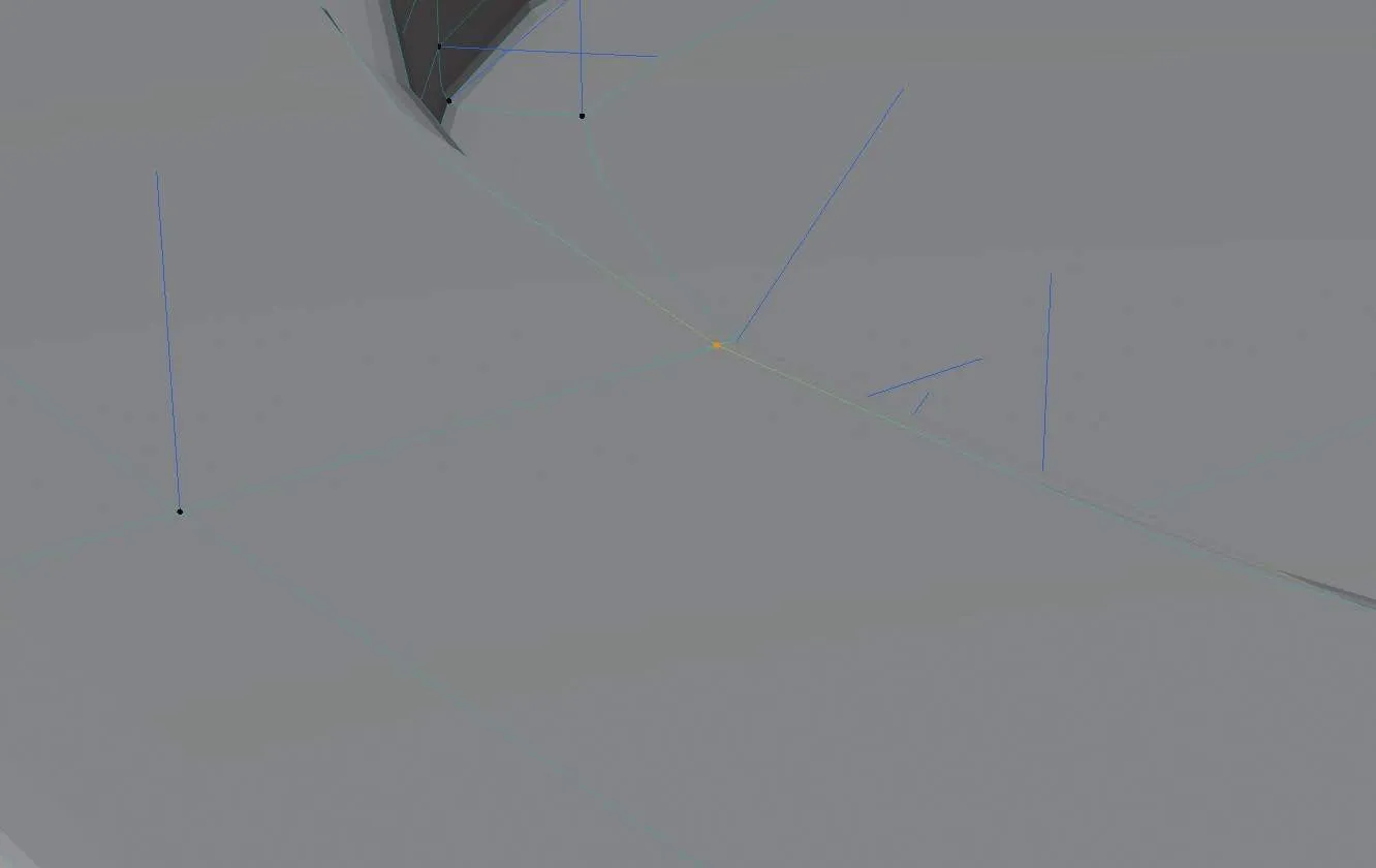 问题 今天遇到一个奇怪的问题,在平面上倒角顶点打洞,细分曲面后有问题,排查许久,发现是一个顶点的法线反了 细分前,这个点法线朝上 细分后,这个点法线不见了 换个角度,可以看到这个点法线跑到下面去了 导致的结果就是,本来应该流畅向下的曲线,在中间转了个圈,使细分曲面出了问题 解决方法 这个问题困扰了我好一会儿,最后发现是忘记改四边面了…我太菜了