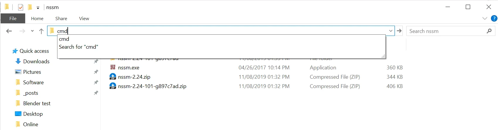 - 在nssm.exe所在的文件夹打开cmd,输入