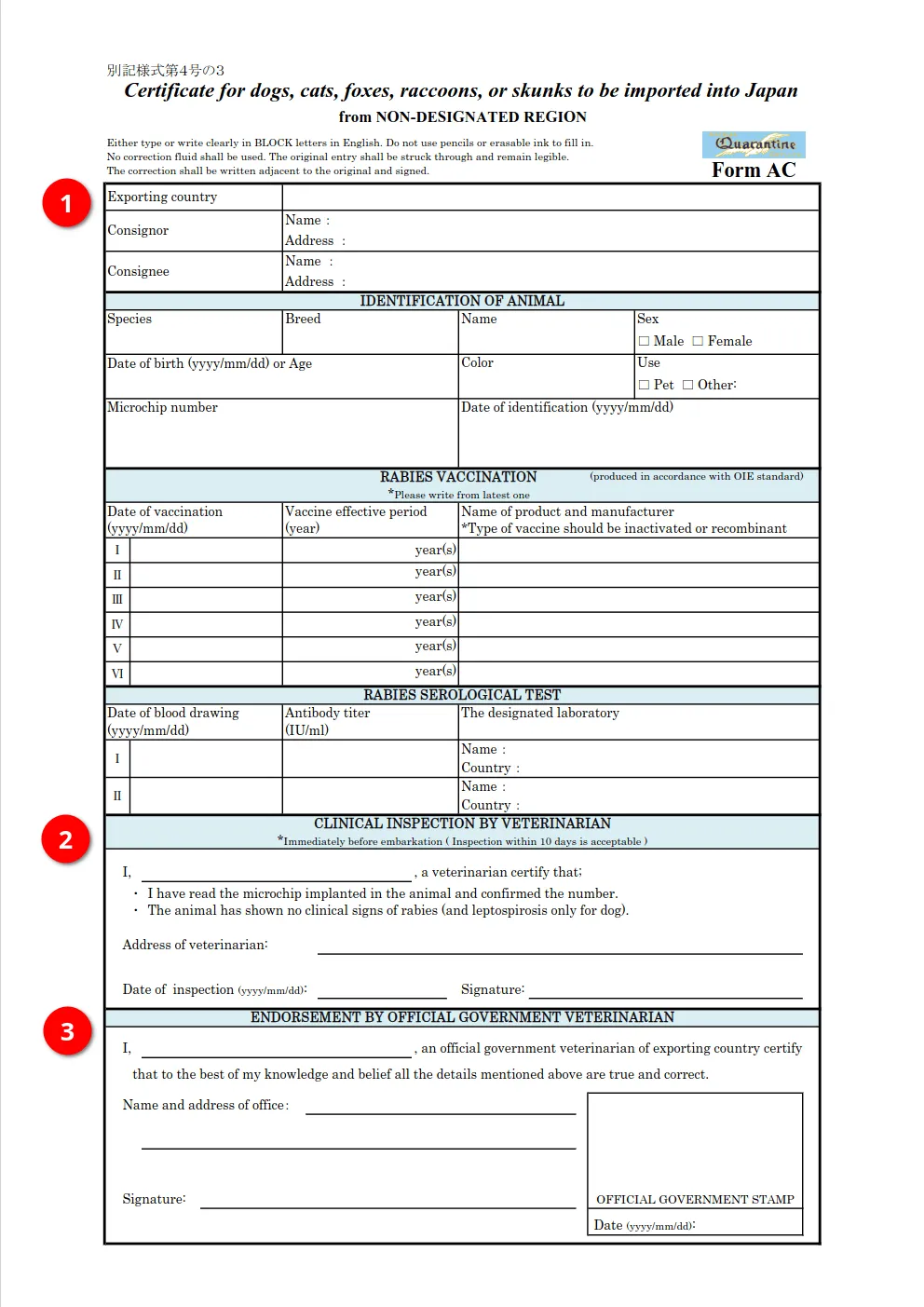 このため、まず当メールの添付ファイルから推奨様式(Form AC)を印刷します。(FormACは添付の記入例を参照してください。)そして、中国から出国する10日以内に検験局指定の動物病院にて健康診断を受診の上、Form ACの作成を依頼し、動物病院のスタンプ及び担当獣医師のサインを取得してください。