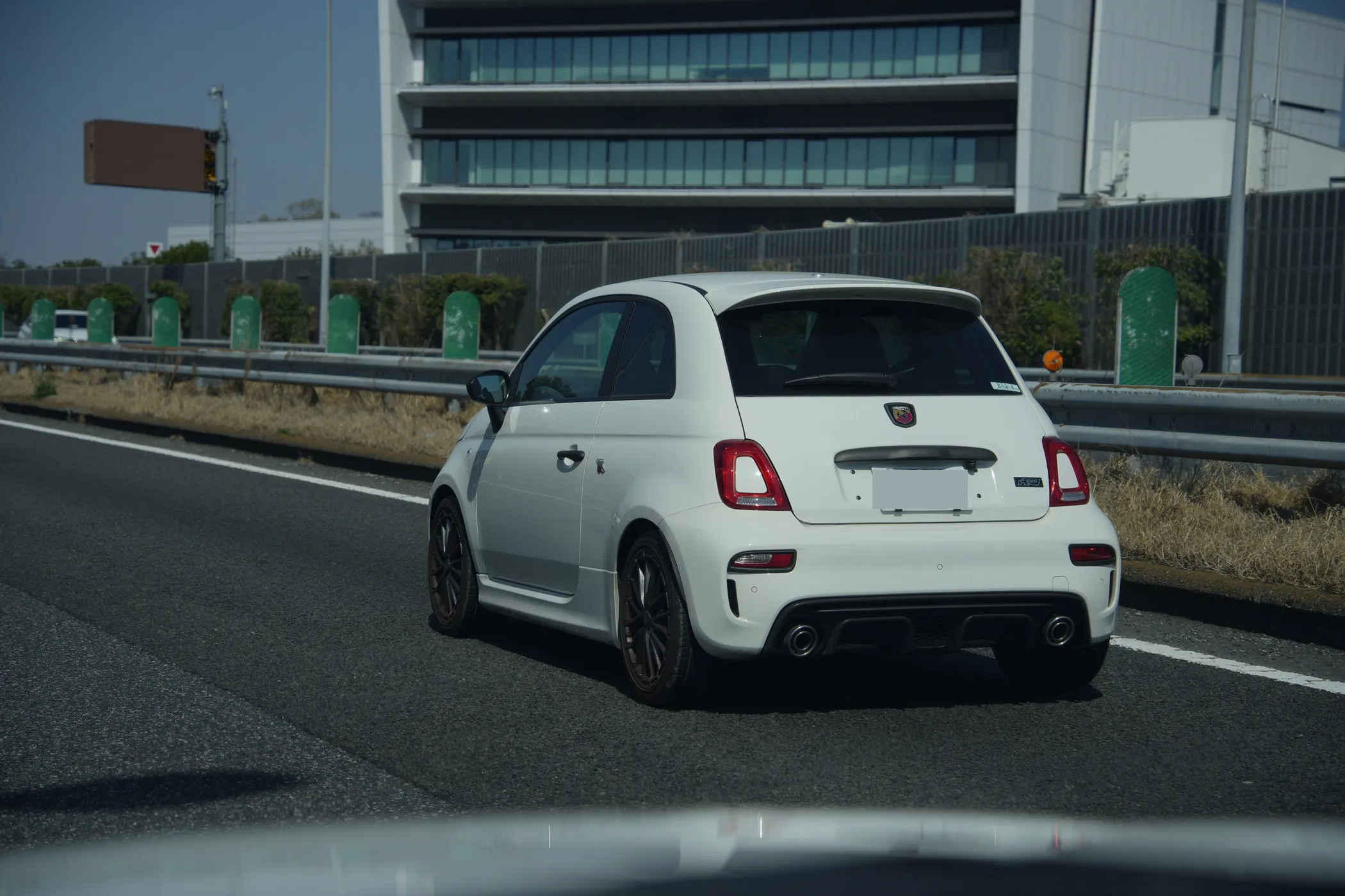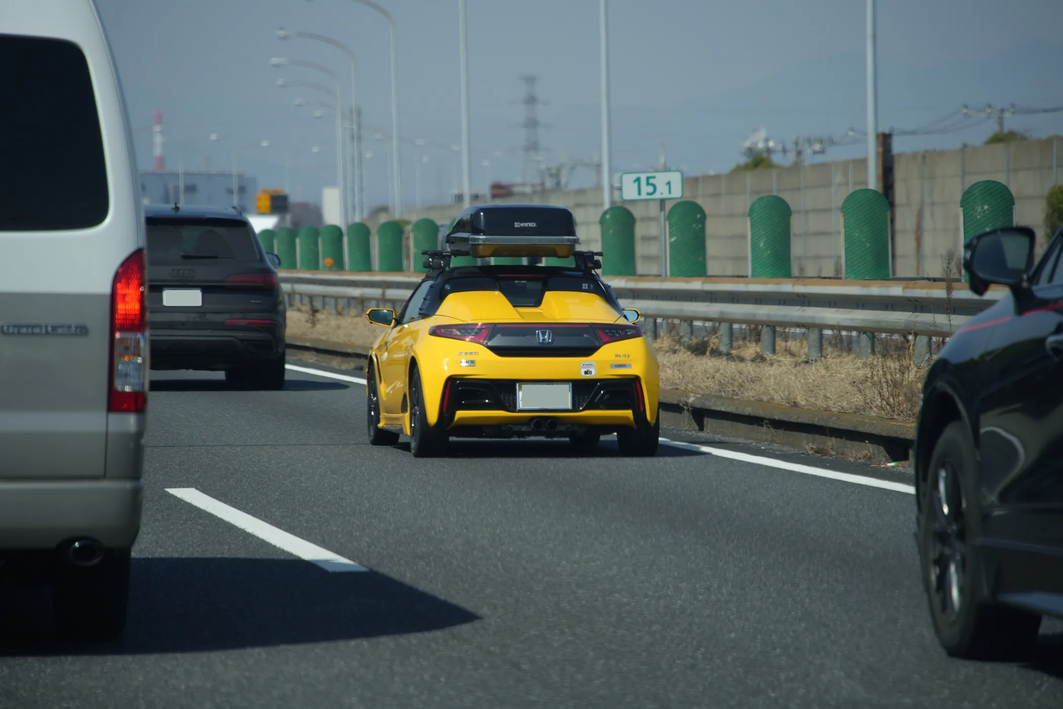 好帅的小跑车,加上头顶的旅行箱才勉强和前面 SUV 一个身高
